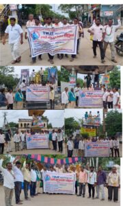 . జర్నలిస్టుల దీర్ఘ కాలికమైన ఇండ్ల సమస్యలను పాలకులు, ప్రజా ప్రతినిధులు పట్టించు కొని నిర్లక్ష్యాలను నిరసిస్తూ కొల్లాపూర్ లో రిలే నిరాహర దీక్షలు చేస్తున్న టి డబ్ల్యూ జేఎఫ్ రాష్ట్ర ఉపాధ్యక్షులు తాటికొండ కృష్ణ, నాగర్ కర్నూల్ జిల్లా అధ్యక్షులు యస్. రామచంద్రయ్య, తాలూకా కన్వీనర్ జలకం మద్దిలేటి, జిల్లా నాయకులు యస్.పి. మల్లికార్జున సాగర్, సీనియర్ జర్నలిస్టులు బి. కురుమయ్య, సిపి నాయుడు, కారంగి గోవిందు, రమణా జి రావు, పేరుమల్ల స్వామి, మల్లేష్, పరుశురాం, తరుణ్, జల్లాపూర్ సురేందర్, కేశవులు తదితరులు దీక్షా శిబిరం నుండి కొల్లాపూర్ పట్టణ వీధుల్లో సోమవారం రోజు ర్యాలీ నిర్వహించారు. జర్నలిస్టులకు ఇళ్ల స్థలాలు మంజూరు చేయాలని, పక్కా గృహ నిర్మాణాలకు ఆర్థిక సహాయాలు అందించాలని, అక్రిడేషన్ కార్డులను నూతనం గా మంజూరు చేయాలని, జర్నలిస్టులకు వారి కుటుంబ సభ్యులకు తెలంగాణ రాష్ట్ర వ్యాప్తం గా ఆర్టీసీ బస్సులలో ఉచిత ప్రయాణం చేసేందుకు, అలాగే రైల్వేలలో జర్నలిస్టులు ఉచితం గా ప్రయాణం చేసేందుకు రైల్వే పాసులను మంజూరు చేయాలని, జర్నలిస్టు కుటుంబ సభ్యులకు జర్నలిస్టులకు కార్పొరేట్ ఆసుపత్రులలో ఉచితం గా వైద్య సేవలు అందించేందుకు అవకాశాలు కల్పించాలని, కొల్లాపూర్ లో ప్రభుత్వ పరం గా ప్రెస్ క్లబ్ ను నిర్మించాలని జర్నలిస్టులు నినాదాలు చేశారు.