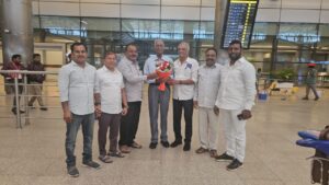 సిపిఐ తెలంగాణ రాష్ట్ర నాలుగో మహాసభలు రేపటినుండి మేడ్చల్ జిల్లా పరిధిలోని కుత్బుల్లాపూర్ లో జరుగుతున్నాయి మహాసభలకు హాజరు కావడానికి ఢిల్లీ నుండి ఈరోజు హైదరాబాదుకు వచ్చిన సందర్భంగా శంషాబాద్ అంతర్జాతీయ విమానాశ్రయంలో సిపిఐ అఖిలభారత ప్రధాన కార్యదర్శి డి రాజా గారికి మరియు సిపిఐ జాతీయ కార్యదర్శి డాక్టర్ కే నారాయణ గారికి స్వాగతం పలుకుతున్న సిపిఐ జిల్లా కార్యదర్శి పాలమాకుల జంగయ్య గారు సిపిఐ కంట్రోల్ కమిషన్ సభ్యులు పుస్తకాల నర్సింగ్ రావు గారు మరియు సిపిఐ రాష్ట్ర సమితి సభ్యులు పానుగంటి పర్వతాలు గారు ఇతర నాయకులు స్వాగతం పలికారు