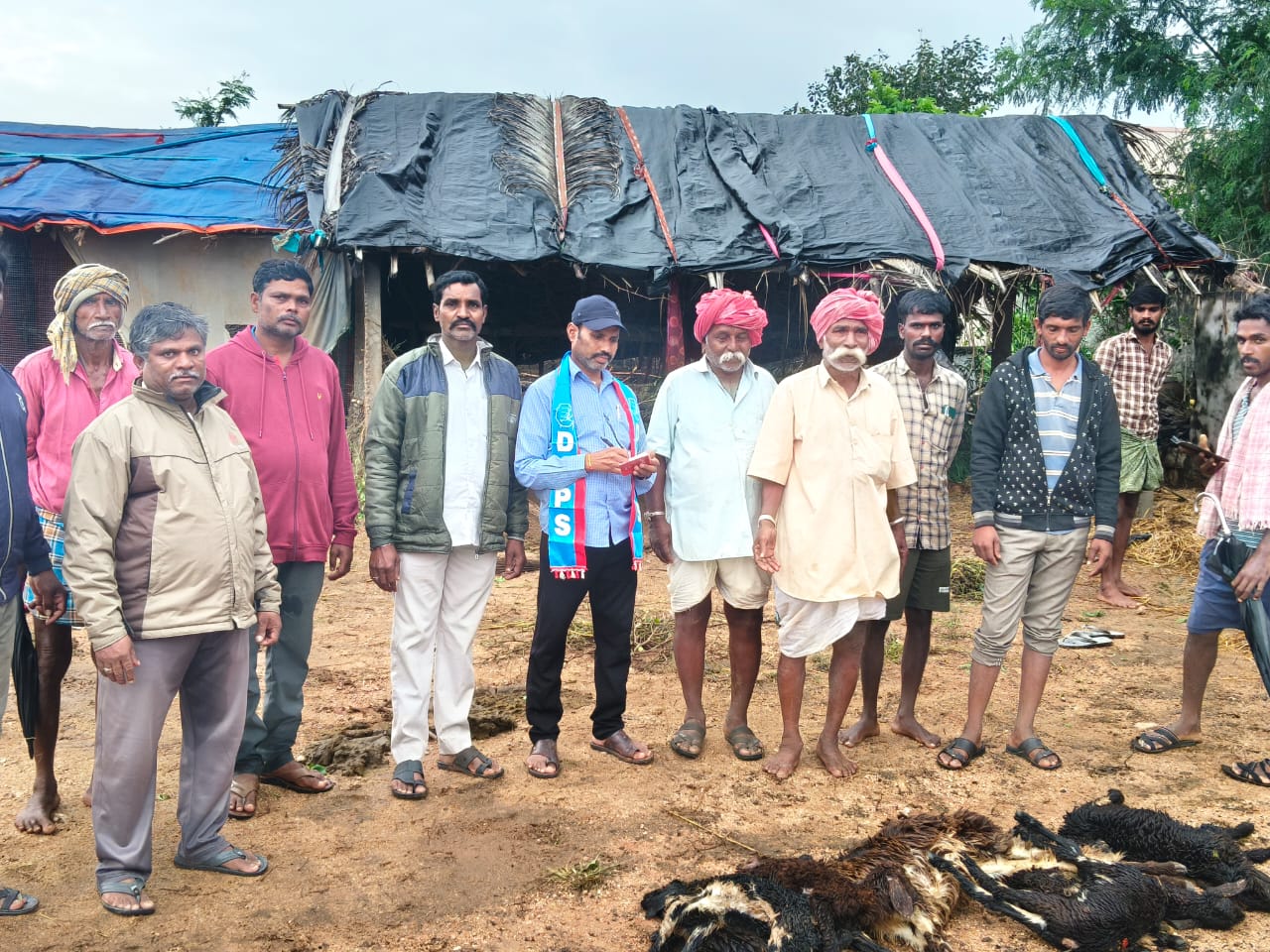 బుధవారం నాడు రాత్రి జరిగిన ఘటనలో గొర్రెలు చనిపోయిన కుటుంబాలను వారు పరామర్శించారు. ఈ సందర్భంగా కొమ్ము భరత్ మాట్లాడుతూ మంగళవారం నాడు సాయంత్రం నుండి తుఫాన్ వర్షం కారణంగా తాండ్ర ముసలయ్య అనే గొర్రెల కాపరి గొర్రెలు 50 నుండి 60 దాకా మరణించాయి అలాగే అదే గ్రామానికి చెందిన బండారు రామచంద్రి 50 గొర్రెలు చనిపోయినవి ఒక్కొక్కరికి మూడున్నర లక్షల దాకా నష్టం వాటిల్లింది అలాగే గోవిందా పెళ్లి గ్రామంలో బొంకురి నారాయణ ఇరవై గొర్రెలు బొంకూరు బచ్చన్న 20 గొర్రెలు చనిపోయాయి గొట్టాల కాశన్న 35 గొర్రెలు చనిపోయినవి వారికి ఒక్కొక్కరికి రెండున్నర లక్షల దాకా నష్టం మరొకరికి మూడు నాలుగు లక్షల దాకా నష్టం వాటిల్లినది కాబట్టి ప్రభుత్వం తక్షణమే ఆ కుటుంబాలకు నష్టపరిహారం చెల్లించి ఆదుకోవాలని గొర్రెలే జీవనాధారంగా బ్రతుకుతెరువుగా భావిస్తూ భూమిపైన బ్రతుకుతున్నటువంటి గొర్రెల కాపరులు అలాంటివారికి ఈ తుపాను కారణంగా భారీ నష్టం సంభవించినది అధికారులు పరామర్శించి కంటి తుడుపు చర్యలు చేపట్టడం కాకుండా తక్షణం ప్రభుత్వానికి నివేదికలు అందించి వారికి పరిహారం అందేలా చర్యలు చేపట్టాలని వారు డిమాండ్ చేశారు. ఇల్లు ఇడుపు భార్యా పిల్లలను వదిలేసి నిత్యం జివాలను మేపుకోవటం కోసం శ్రీశైలం అడవులు నల్లమల అడవులు అన్ని తిరుగుతూ వచ్చి నాలుగు రోజులు అయ్యి ఊర్లో పత్తి చేతులను మేపుకుంటూ ఆ చేలలోనే మంద వేసుకొని ఉన్న సమయంలో నిన్న రాత్రి సంభవించినటువంటి అతి భారీ వర్షం వలన భారీ ఈదురుగాల వలన పెద్ద ఎత్తున గొర్రెలు మేకలు మరణించాయి భారీ నష్టం సంభవించే కుటుంబాలు ఘోషిస్తున్నాయి. స్థానిక ఎమ్మెల్యే గారు ఎంపీ గారు అలాగే మంత్రి జూపల్లి కృష్ణారావు గారు చొరవ తీసుకొని ఆ కుటుంబాలను ఆదుకునే విధంగా చర్యలు తీసుకోవాలని అధికారులు కూడా కుటుంబాలను ఆదుకునే విధంగా నివేదికలు పంపించి తక్షణం వా బాధిత కుటుంబాలను ఆదుకొని మానవత్వాన్ని చాటుకోవాలని వారు విజ్ఞప్తి చేశారు. ఈ కార్యక్రమంలో ప్రజా సంఘాల నాయకులు వెంకటస్వామి, గొల్ల రవి, బచ్చలు తిరుపతి, పోలేము నీ బాలయ్య, బాధితులు తాండ్ర ముసలయ్య, బండారు రామచంద్రి, బండారు మురళి, బొంకూరి నారాయణ, బొంకూరి బచ్చన్న, గొట్టాల కాశన్న, డి హెచ్ పి ఎస్ నాయకులు అభినవ్ తదితరులు పాల్గొన్నారు.