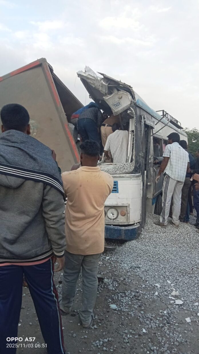 వివరాలలోకి వెళితే తాడూరు నుంచి హైదరాబాదుకు సుమారు 70 మంది ప్రయాణికులతో వస్తున్న ఆర్టీసీ బస్సును ఎదురుగా వస్తున్న కంకర టిప్పర్ ఢీకొట్టింది.