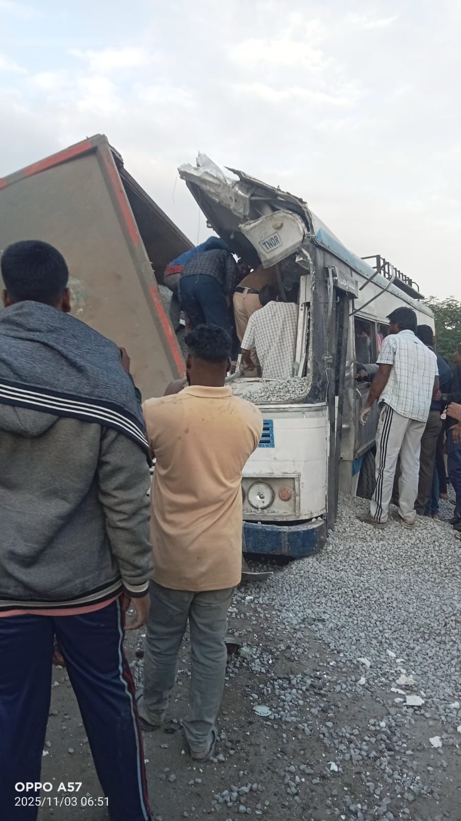 ప్రమాదం తీవ్రతకు టిప్పర్ లోని కంకర మొత్తం బసు పై పడిపోయింది దీంతో బస్సులోని ప్రయాణికులు కంకర రాళ్ల కింద చిక్కుకుపోయి ఊపిరి అడగా ప్రాణాలు కోల్పోయారు సమాచారం అందుకున్న పోలీసులు వెంటనే ఘటన స్థలానికి చేరుకొని సహాయక చర్యలు చేపట్టారు. క్షతగాత్రులను బయటకు తీస్తున్నారు ప్రమాదానికి గురైన వాళ్ళు ఎక్కువమంది విద్యార్థులు ఉద్యోగులు ఉన్నారు ఆదివారం సెలవు కావడంతో తమ స్వస్థలoకు వెళ్లి తిరిగి సోమవారం ఉదయం హైదరాబాదుకు వస్తున్నగా ఈ విషాదం జరిగింది మృతుల్లో హైదరాబాద్. లో వాళ్ళు కళాశాలలో చదువుతు న్న విద్యార్థులు ఉన్నట్లు తెలుస్తోంది.