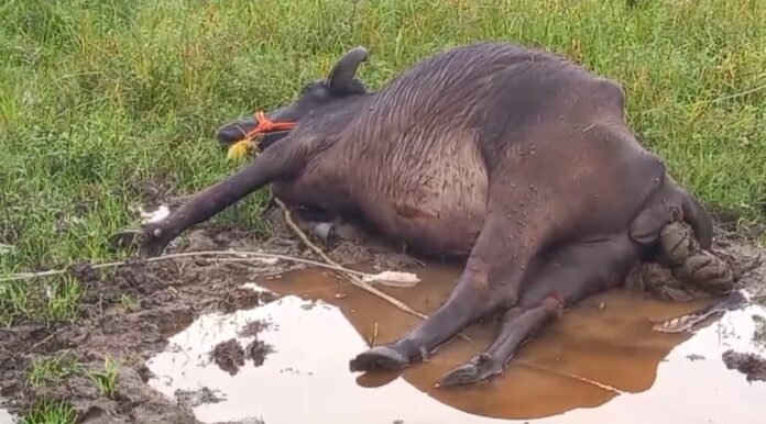నేటి సత్యం న్యూస్: గన్నేరువరం, నవంబర్ 4 (రమేష్ రిపోర్టర్):- కరీంనగర్ జిల్లా గన్నేరువరంమండల కేంద్రంకు చెందిన బండపల్లి మనోహర్ అనే రైతు పాడి గేదే మంగళవారం ఉదయం విద్యుత్ ఘాతానికి గురై మృతి చెందింది. ఈ సందర్భంగా రైతు మనోహర్ మాట్లాడుతూ వేలాడుతున్న విద్యుత్ వైర్లను సవరించాలని ఎన్నిసార్లు విద్యుత్ అధికారుల కు చెప్పినప్పటికీ వారు నిర్లక్ష్యం చేశారని, ఈదురు గాలులకు విద్యుత్ తీగలు తెగి గేద పైన తెగిపడడం అక్కడికక్కడే మృతి చెందిందని ఆవేదన వ్యక్తం చేశారు. రోజుకు ఐదు, ఆరు లీటర్ల పాలు ఇస్తూ తనకు జీవనాధారమైన గేద చనిపోవడం తో రూ. 70000 ఆర్థిక నష్టంతో పాటు బ్రతుకుతెరువు పోయిందని ఆవేదన వ్యక్తం చేశాడు వెంటనే ప్రభుత్వం తనను ఆదుకోవాలని డిమాండ్ చేశారు.