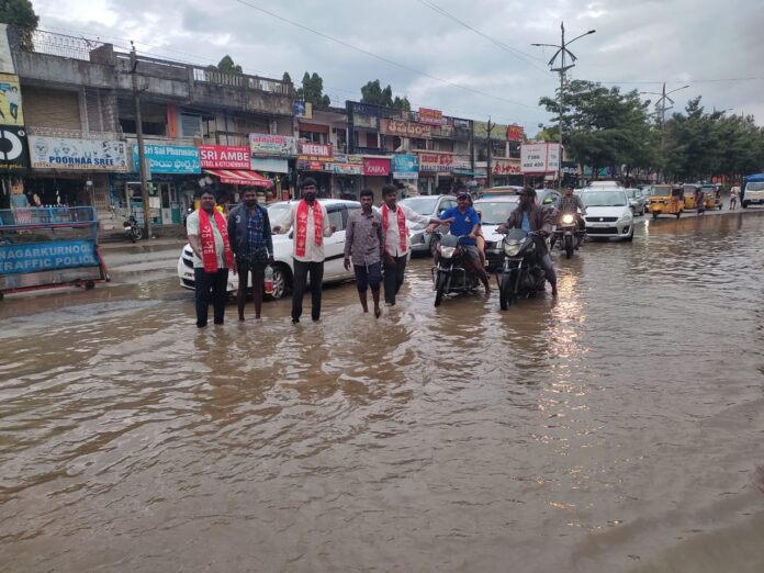 నాగర్ కర్నూల్ బస్టాండు డాక్టర్ బి.ఆర్ అంబేద్కర్ చౌరస్తా, రామ్ నగర్ కాలనీ బిఎస్ఎన్ఎల్ ఆఫీస్, ఇంకా చిన్న చిన్న కాలనీలో వర్షానికి మునిగి ఇండ్లలోకి షాపుల్లోకి నీరు రావడం జరిగింది, టౌన్ పరిస్థితి ఇలాగే ఉంటే చిన్న గ్రామాల పరిస్థితి ఏందని అన్నారు, ఇప్పటికైనా మున్సిపాలిటీ అధికారులు టౌన్ ప్లానింగ్ అధికారులు చర్యలు తీసుకొని నగర అభివృద్ధికి పాటుపడి డ్రైనేజీ వ్యవస్థను మెరుగుపరిచి పట్టణ ప్రజలకు ఇబ్బందులు లేకుండా చూడాలన్నారు, అసలే వానకాలం కారణంగా ప్రజలకు విష జ్వరాలు ఇంట్లో ఒకరు నుంచి మొదలుకొని నలుగురు దాకా జ్వరాళ్ల బారిన పడుతున్నారు, హాస్పిటల్ కి వెళ్లి చూపించుకున్నామన్న హాస్పిటల్ సదుపాయాలు లేక ప్రైవేట్ హాస్పిటల్ కి వెళ్తే అధిక ఫీజులు మోయలేక నానా అవస్థలు పడుతున్నారు, ఇప్పటికైనా మున్సిపాలిటీ అధికారులు చర్యలు తీసుకొని నాగర్ కర్నూల్ పట్టణ పురవీధుల గుండా తిరిగి ఎక్కడ ఇబ్బందులు ఉన్నాయో అక్కడ పరిష్కరించే విధంగా అధికారులు చర్యలు తీసుకోవాలని లేనియెడల సిపిఐ పార్టీ నాగర్ కర్నూల్ టౌన్ ఆధ్వర్యంలో మున్సిపాలిటీ ఆఫీసును ముట్టడిస్తామని హెచ్చరించారు,