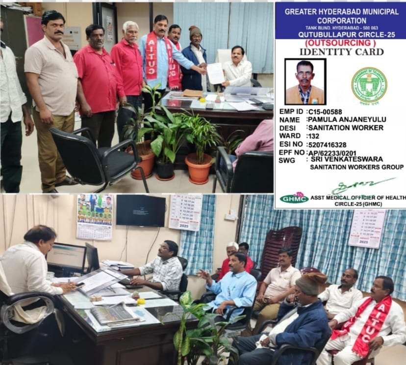 కుత్బుల్లాపూర్ సర్కిల్ పరిధిలో పారిశుద్ధ్య విధులు నిర్వహిస్తున్న పాముల ఆంజనేయులు తేదీ:14 /11/ 2025 రోజు ఉదయం విధులకు వచ్చినాడు శానిటేషన్ ఫీల్డ్ అసిస్టెంట్(SFA) అతన్ని పేస్ స్కానింగ్ చేసి ఉదయం ఐదున్నర గంటలకు హాజరు తీసుకోవడం జరిగింది. అతను విధులు నిర్వహిస్తూ చెత్త తీసుకొని నర్సరీ దగ్గర చెత్తని తొలగించడం జరిగింది. మధ్యాహ్నం కూడా హాజరుకు రాలేదు నైట్ కూడా ఇంటికి వెళ్లకపోవడంతో కుటుంబ సభ్యులు ఈరోజు ఉదయం అతని కుటుంబ సభ్యులు విధులు నిర్వహించే దగ్గరికి వచ్చి మా నాన్న ఇంటికి రాలేదు అని వాకప్ చేయగా తోటి కార్మికులు ఇతరులు కలిసి చెత్త డంపింగ్ చేసే దగ్గరికి వెళ్లి చూడగా అతను అందులో కాలిపోయి శవమై కనిపించాడు. కుక్కలు కూడా కాళ్లు పీక తినడం జరిగింది. ఈ విషయం తెలుసుకున్న తెలంగాణ మున్సిపల్ కాంట్రాక్ట్ ఔట్ సోర్సింగ్ వర్కర్స్ యూనియన్ (ఏఐటియుసి) రాష్ట్ర ప్రధాన కార్యదర్శి కె యేసురత్నం, రాష్ట్ర కార్యదర్శి వనంపల్లి జైపాల్ రెడ్డి, కుత్బుల్లాపూర్ మున్సిపల్ డిప్యూటీ కమిషనర్ నరసింహ గారితో కార్మికుడు విధులు నిర్వహిస్తున్న సమయంలోనే మరణించడం జరిగింది. కనుక జిహెచ్ఎంసి సంస్ధ నుండి ఆ కుటుంబానికి 30 లక్షల రూపాయలు ఆర్థిక సహాయం ఇవ్వాలని డిమాండ్ చేయడం జరిగింది. ఆ యొక్క కుటుంబానికి జిహెచ్ఎంసి నుండి వచ్చే అన్ని బెనిఫిట్స్ ఇవ్వాలన్నారు. మరణించిన కార్మికుని ఇంటికి వెళ్లి భార్యా పిల్లలని పరామర్శించడం జరిగింది. ఈ కార్యక్రమంలో మేడ్చల్ జిల్లా ఏఐటీయూసీ ప్రధాన కార్యదర్శి వంగాల శ్రీనివాస్, మేడ్చల్ మల్కాజిగిరి జిల్లా మున్సిపల్ సంఘం అధ్యక్షులు ఉజ్జిని హరినాథరావు, చర్లపల్లి రాములు తదితరులుఈ కార్యక్రమంలో పాల్గొన్నారు.