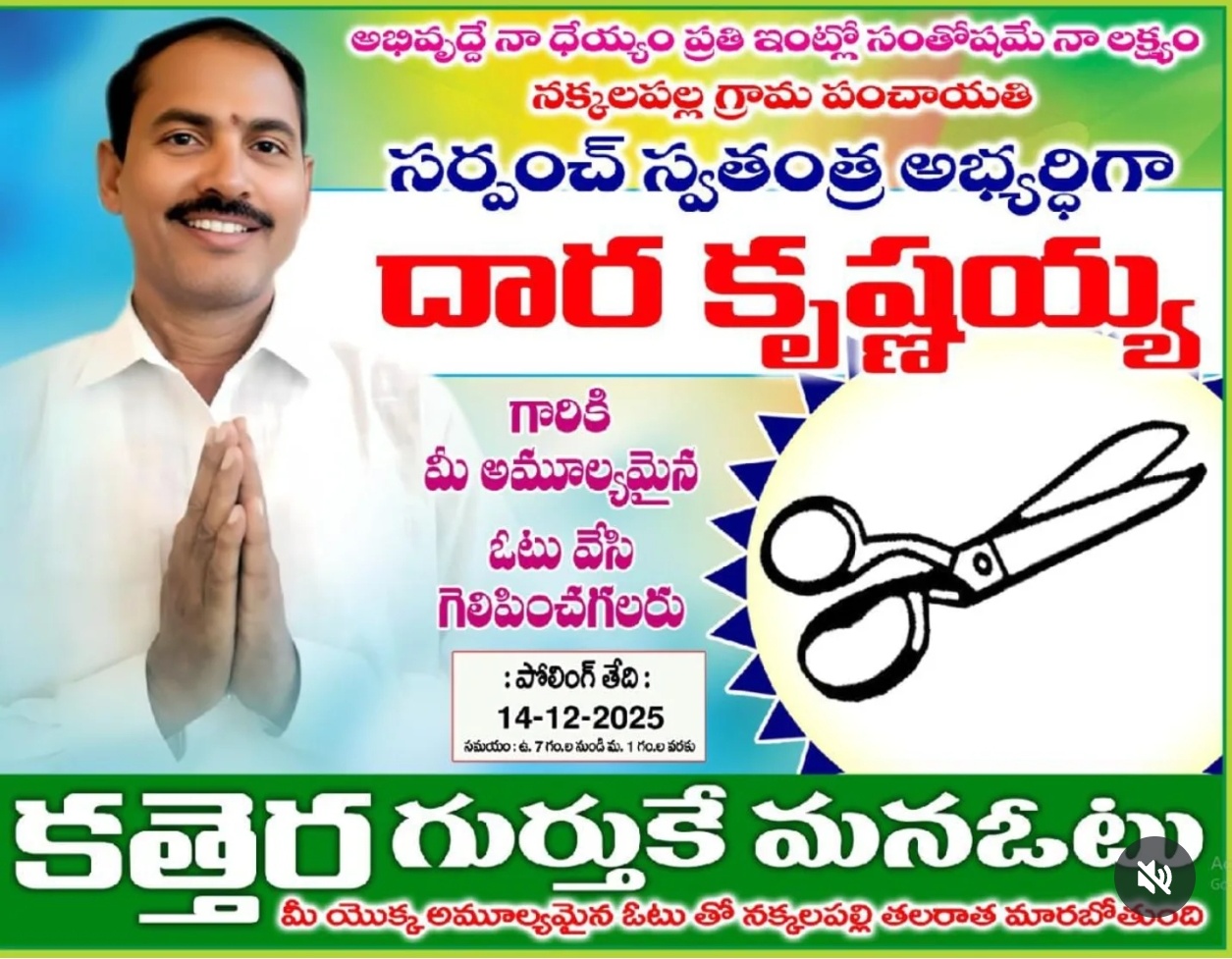 కావున నాకు ఈ గ్రామపంచాయతీ ఎలక్షన్లో కత్తెర గుర్తుపై మీ అమూల్యమైన ఓటు వేసి . నన్ను గెలిపించవలసిందిగా విజ్ఞప్తి చేస్తున్నా. దారా కృష్ణ.