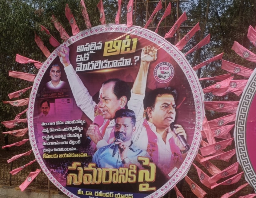 కెసిఆర్, కేటీఆర్ పిడికిలెత్తి నినదిస్తున్నట్లుగా ఉన్న బ్యానర్లు