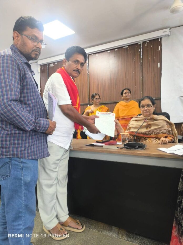 నేటి సత్యం ఏప్రిల్ 6.రంగారెడ్డి జిల్లా కలెక్టర్అబ్దుల్లాపూర్ మెట్టు మండలం, రావి నారాయణరెడ్డి కాలనీ ఫేస్-3 భూ పోరాట కేంద్రంలో అగ్నిప్రమాదంలో కాలిపోయిన గుడిసె వాసులకు న్యాయం చేయాలని అర్హులైన పేదలకు ఇండ్ల పట్టాలు ఇందిరమ్మ ఇండ్లు మరియు కరెంటు మంచినీళ్లు కనీస మౌలిక వసతులు కల్పించాలని కోరుతూ రంగారెడ్డి జిల్లా కలెక్టర్ కార్యాలయం ప్రజావాణిలో ఫిర్యాదు చేసిన సిపిఐ రాష్ట్ర కార్యవర్గ సభ్యులు అందోజు రవీంద్ర చారి గారు, వాలంటరీ కమాండర్ శ్రీధర్ రెడ్డి, సోషల్ మీడియా మండల కో కన్వీనర్ బావిరాల అశోక్ పాల్గొన్నారు